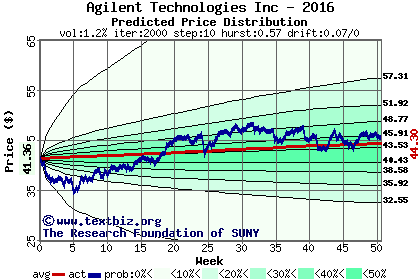 The high to date and low to date prices of the stock plotted against a random walk model for 2016 (what's this?).