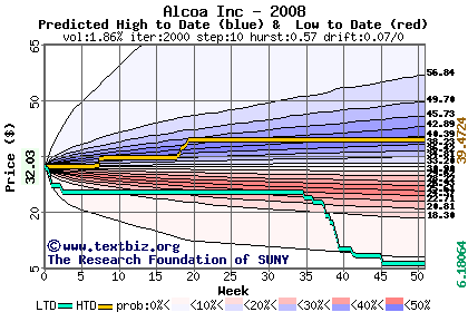 The high to date and low to date prices of the stock plotted against a random walk model for 2008 (what's this?).
