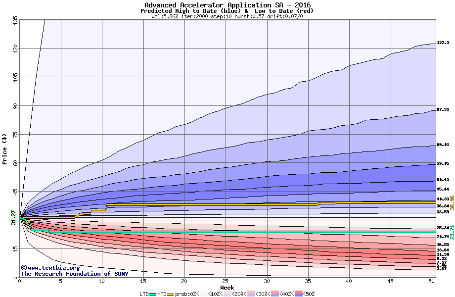 The high to date and low to date prices of the stock plotted against a random walk model for 2016 (what's this?).