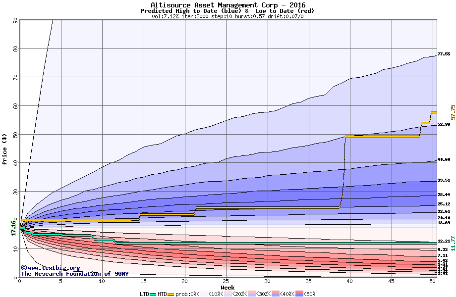 The high to date and low to date prices of the stock plotted against a random walk model for 2016 (what's this?).