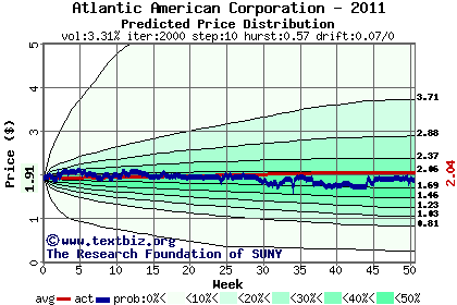 The high to date and low to date prices of the stock plotted against a random walk model for 2011 (what's this?).