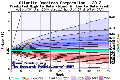 The high to date and low to date prices of the stock plotted against a random walk model for 2012 (what's this?).
