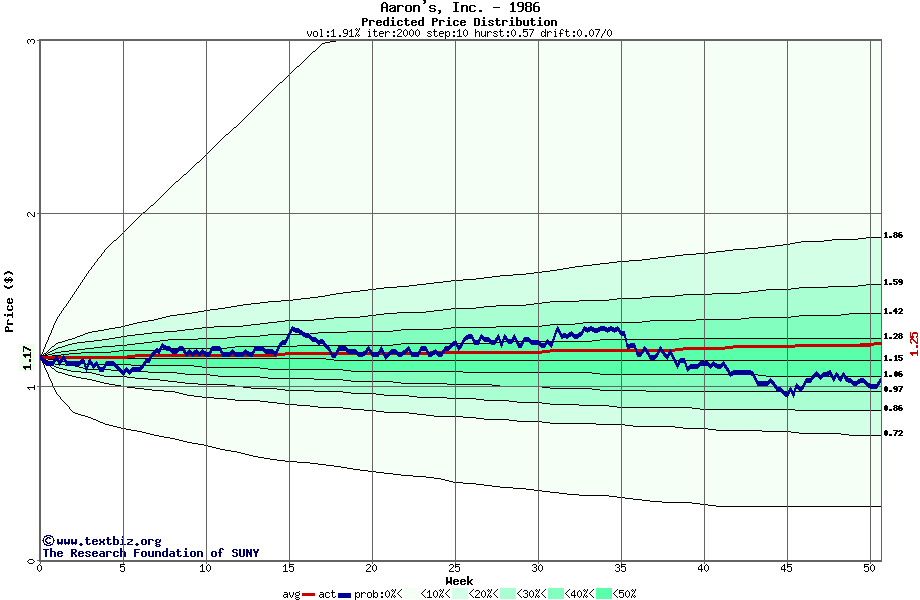 The following graph plots the year-to-date performance of the stock for 1986 compared to the probability calculated by a random walk model.