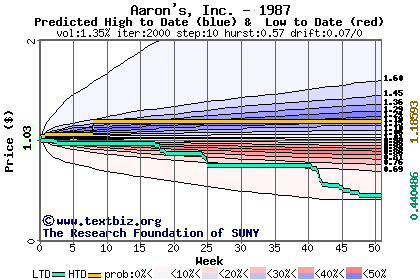 The high to date and low to date prices of the stock plotted against a random walk model for 1987 (what's this?).
