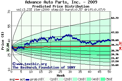 The high to date and low to date prices of the stock plotted against a random walk model for 2009 (what's this?).