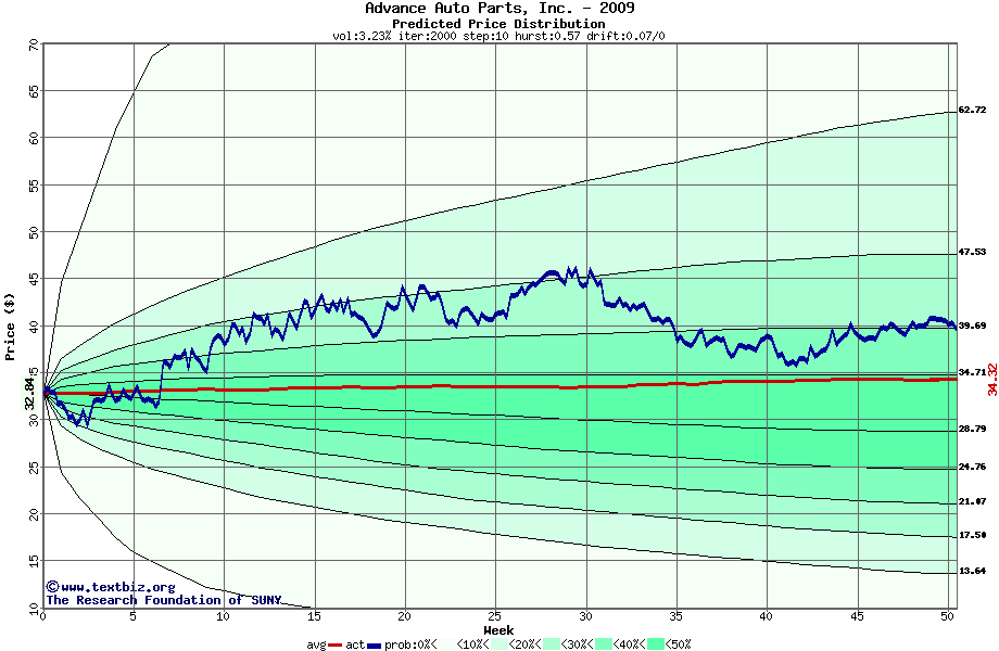 The following graph plots the year-to-date performance of the stock for 2009 compared to the probability calculated by a random walk model.