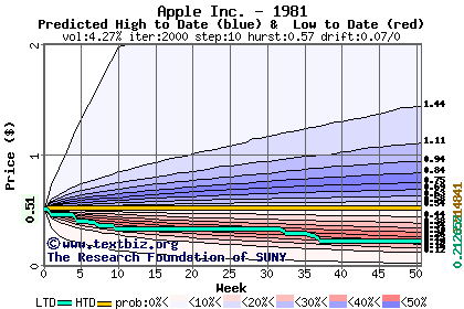 The high to date and low to date prices of the stock plotted against a random walk model for 1981 (what's this?).