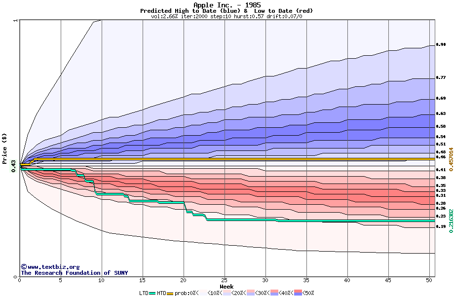 The high to date and low to date prices of the stock plotted against a random walk model for 1985 (what's this?).