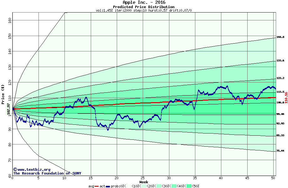 The following graph plots the year-to-date performance of the stock for 2016 compared to the probability calculated by a random walk model.