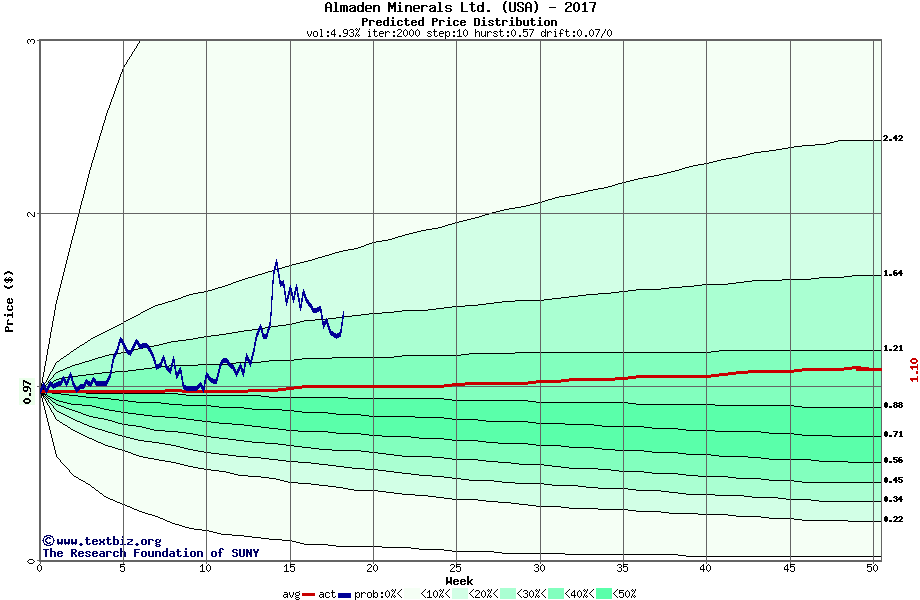 The following graph plots the year-to-date performance of the stock for 2017 compared to the probability calculated by a random walk model.