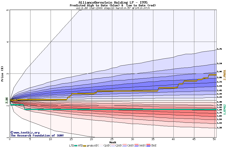 The high to date and low to date prices of the stock plotted against a random walk model for 1995 (what's this?).