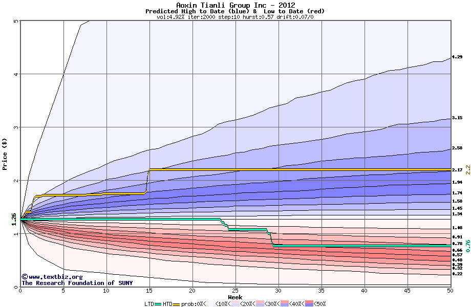 The high to date and low to date prices of the stock plotted against a random walk model for 2012 (what's this?).