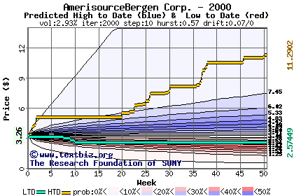The high to date and low to date prices of the stock plotted against a random walk model for 2000 (what's this?).