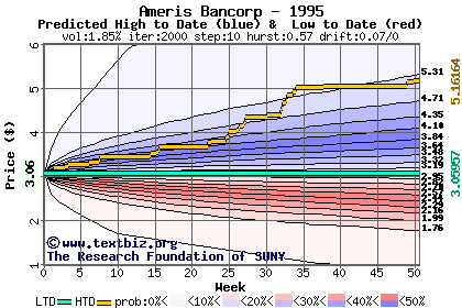 The high to date and low to date prices of the stock plotted against a random walk model for 1995 (what's this?).