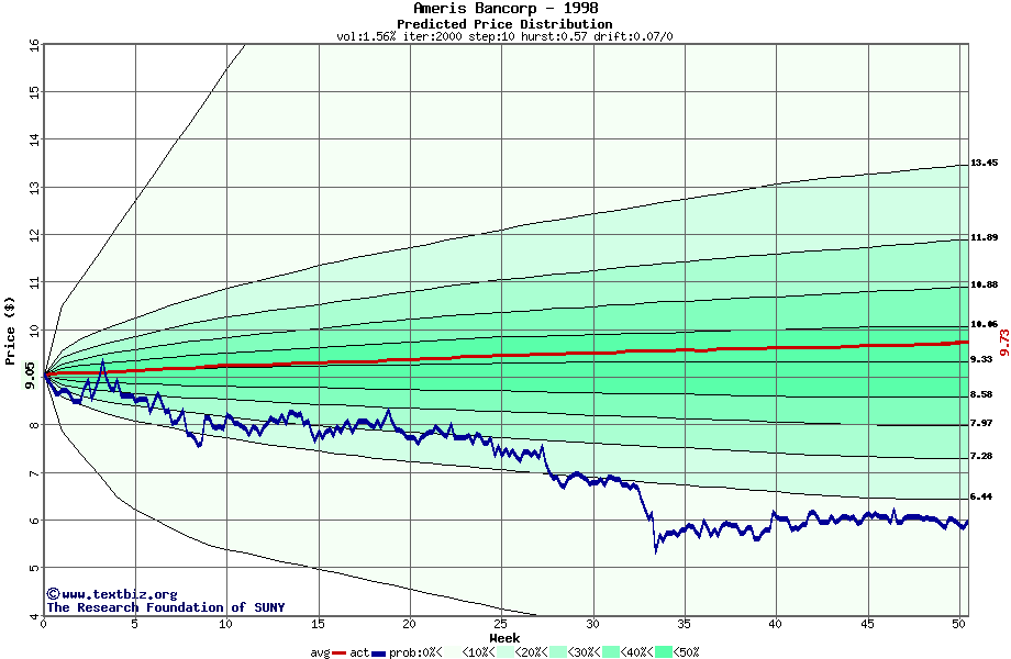 The following graph plots the year-to-date performance of the stock for 1998 compared to the probability calculated by a random walk model.