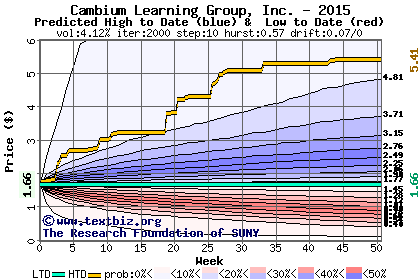 The following graph plots the year-to-date performance of the stock for 2015 compared to the probability calculated by a random walk model.