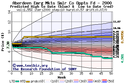 The high to date and low to date prices of the stock plotted against a random walk model for 2000 (what's this?).