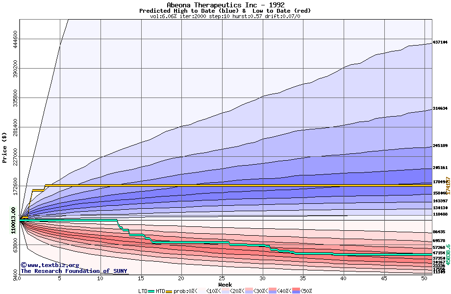 The high to date and low to date prices of the stock plotted against a random walk model for 1992 (what's this?).