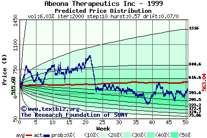 The high to date and low to date prices of the stock plotted against a random walk model for 1999 (what's this?).