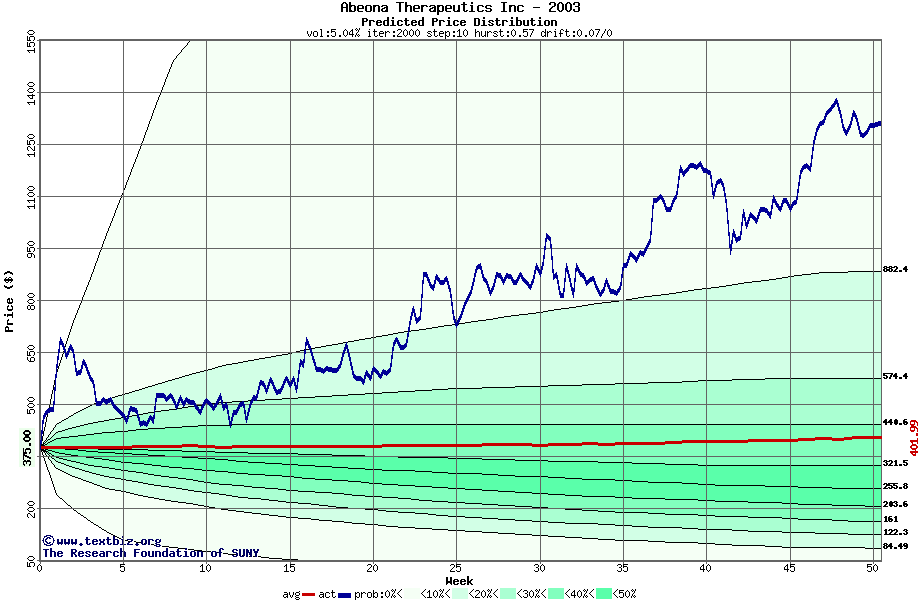 The following graph plots the year-to-date performance of the stock for 2003 compared to the probability calculated by a random walk model.
