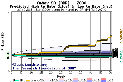 The high to date and low to date prices of the stock plotted against a random walk model for 2000 (what's this?).