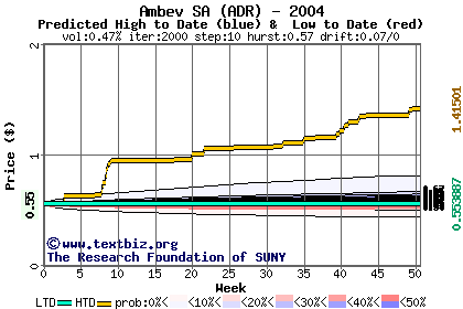 The high to date and low to date prices of the stock plotted against a random walk model for 2004 (what's this?).
