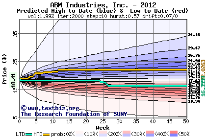 The high to date and low to date prices of the stock plotted against a random walk model for 2012 (what's this?).