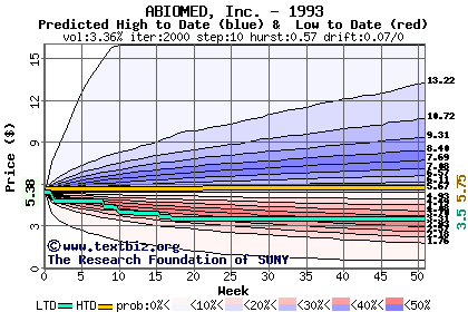 The following graph plots the year-to-date performance of the stock for 1993 compared to the probability calculated by a random walk model.