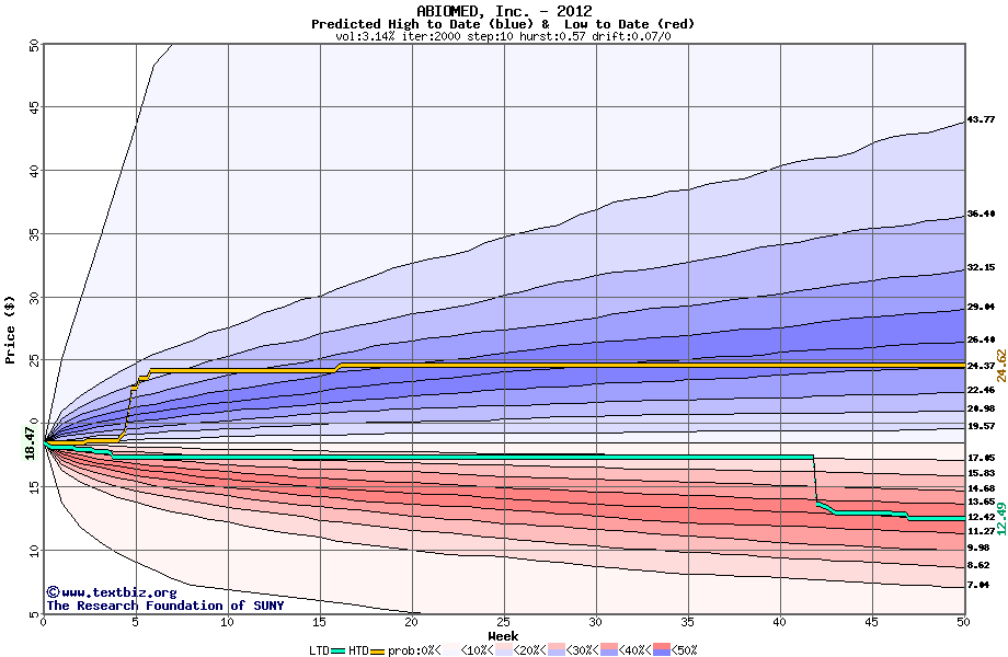 The high to date and low to date prices of the stock plotted against a random walk model for 2012 (what's this?).