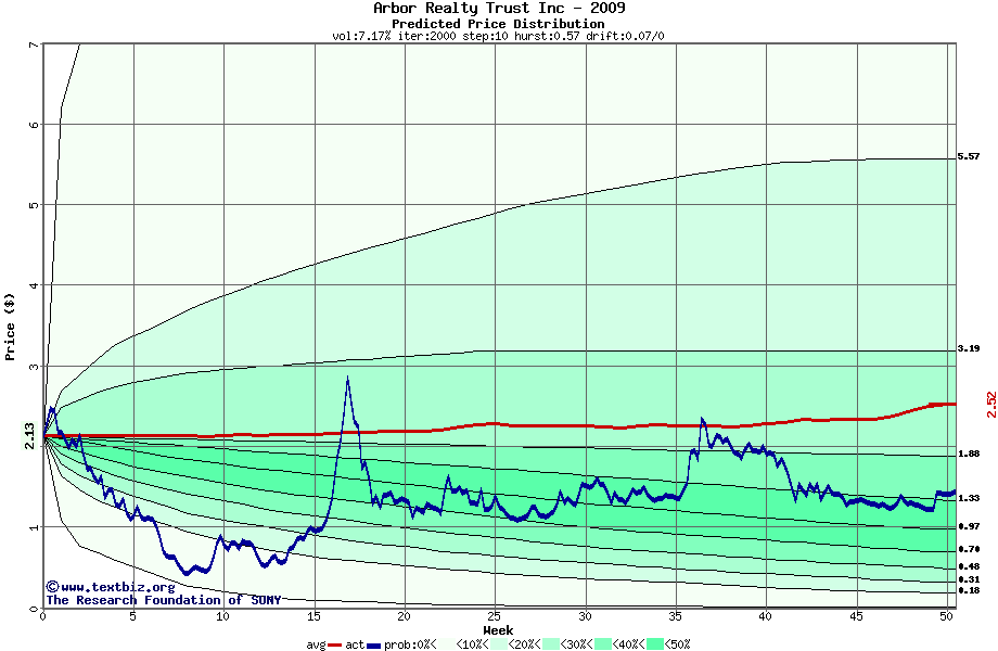 The following graph plots the year-to-date performance of the stock for 2009 compared to the probability calculated by a random walk model.
