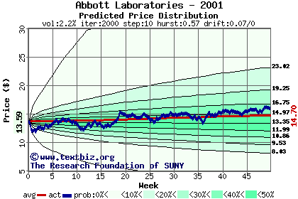 The following graph plots the year-to-date performance of the stock for 2001 compared to the probability calculated by a random walk model.