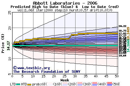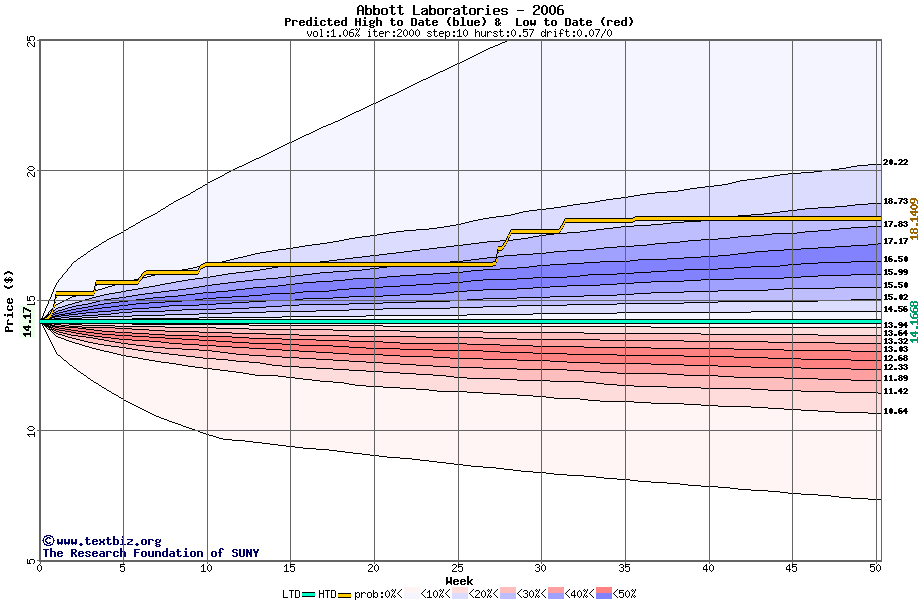 The high to date and low to date prices of the stock plotted against a random walk model for 2006 (what's this?).