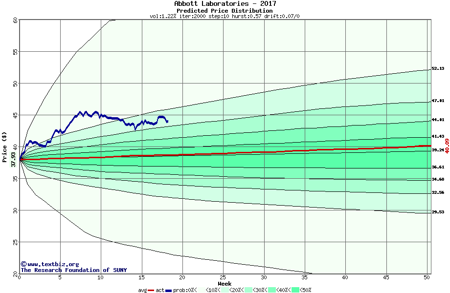 The following graph plots the year-to-date performance of the stock for 2017 compared to the probability calculated by a random walk model.