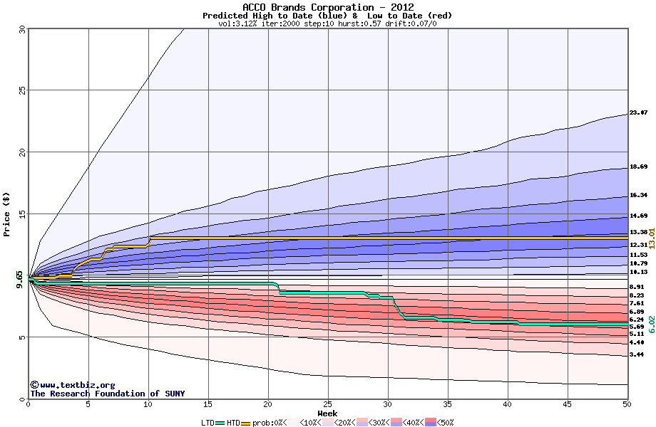 The high to date and low to date prices of the stock plotted against a random walk model for 2012 (what's this?).