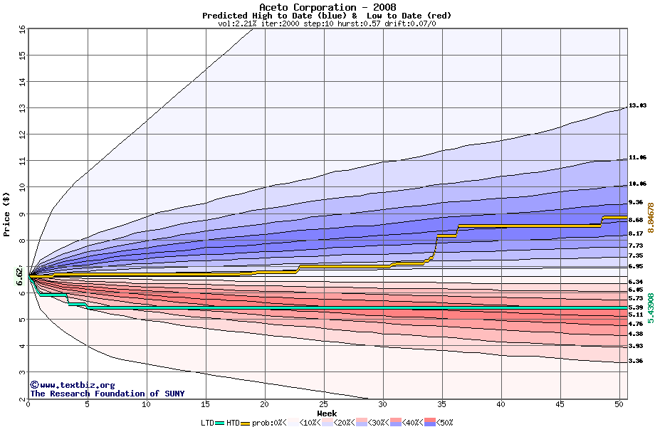 The high to date and low to date prices of the stock plotted against a random walk model for 2008 (what's this?).