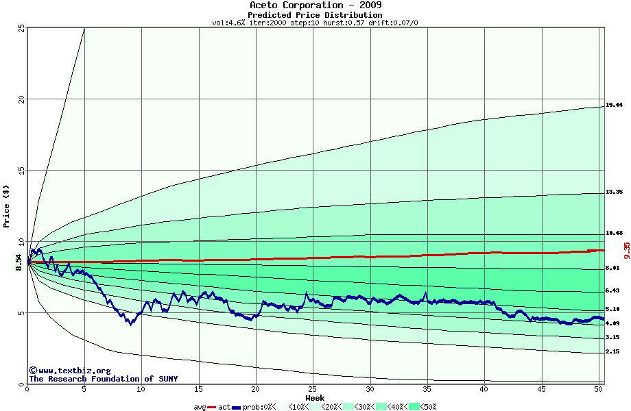 The following graph plots the year-to-date performance of the stock for 2009 compared to the probability calculated by a random walk model.