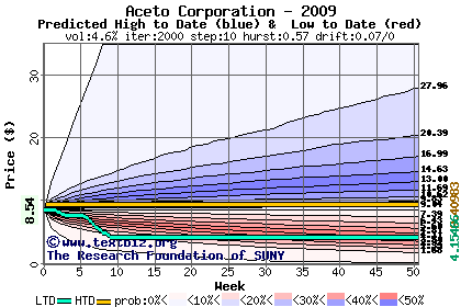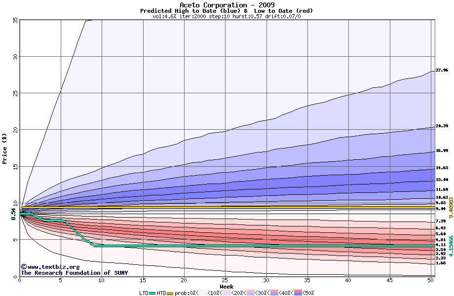 The high to date and low to date prices of the stock plotted against a random walk model for 2009 (what's this?).