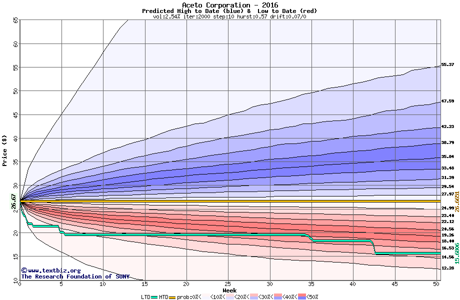 The high to date and low to date prices of the stock plotted against a random walk model for 2016 (what's this?).