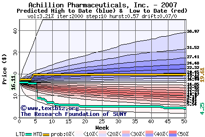 The high to date and low to date prices of the stock plotted against a random walk model for 2007 (what's this?).