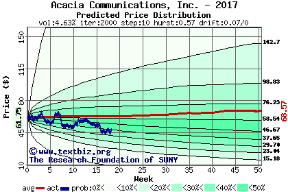The high to date and low to date prices of the stock plotted against a random walk model for 2017 (what's this?).