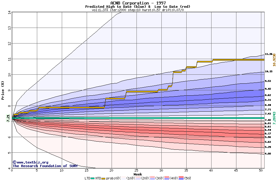 The high to date and low to date prices of the stock plotted against a random walk model for 1997 (what's this?).