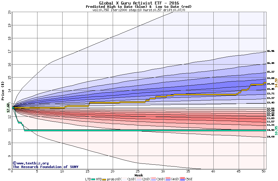 The high to date and low to date prices of the stock plotted against a random walk model for 2016 (what's this?).