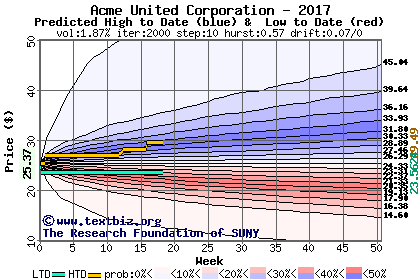 The high to date and low to date prices of the stock plotted against a random walk model for 2017 (what's this?).
