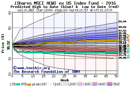The high to date and low to date prices of the stock plotted against a random walk model for 2016 (what's this?).