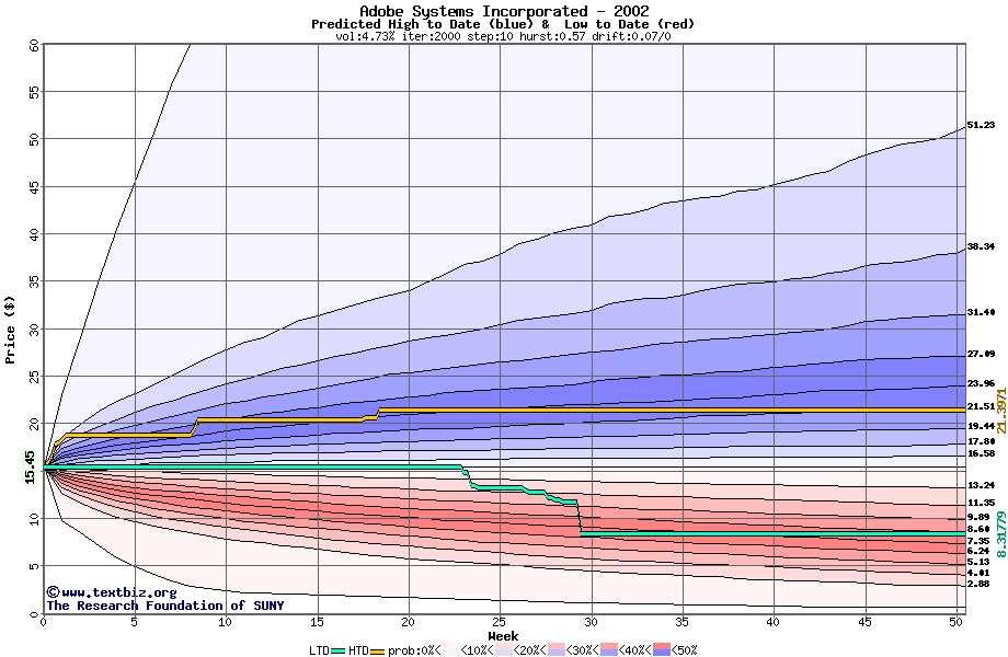 The high to date and low to date prices of the stock plotted against a random walk model for 2002 (what's this?).