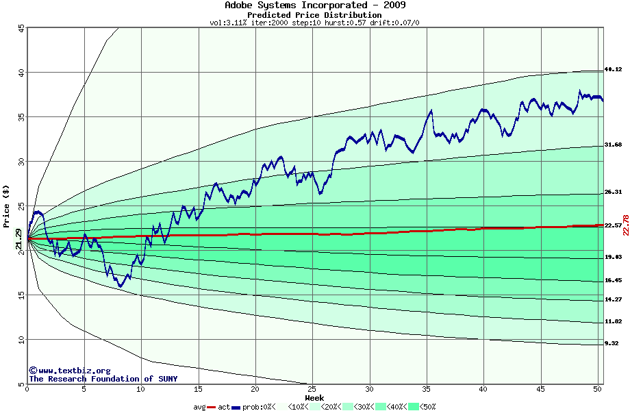 The following graph plots the year-to-date performance of the stock for 2009 compared to the probability calculated by a random walk model.