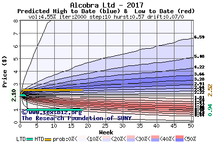 The high to date and low to date prices of the stock plotted against a random walk model for 2017 (what's this?).