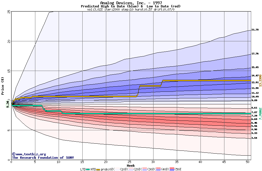 The high to date and low to date prices of the stock plotted against a random walk model for 1997 (what's this?).