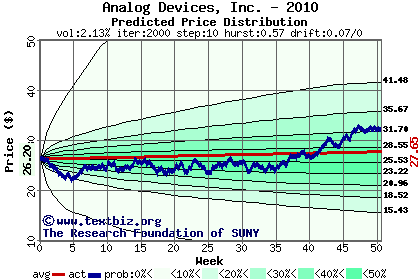 The following graph plots the year-to-date performance of the stock for 2010 compared to the probability calculated by a random walk model.