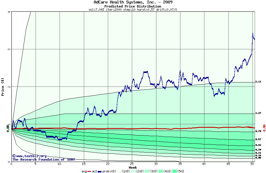 The following graph plots the year-to-date performance of the stock for 2009 compared to the probability calculated by a random walk model.